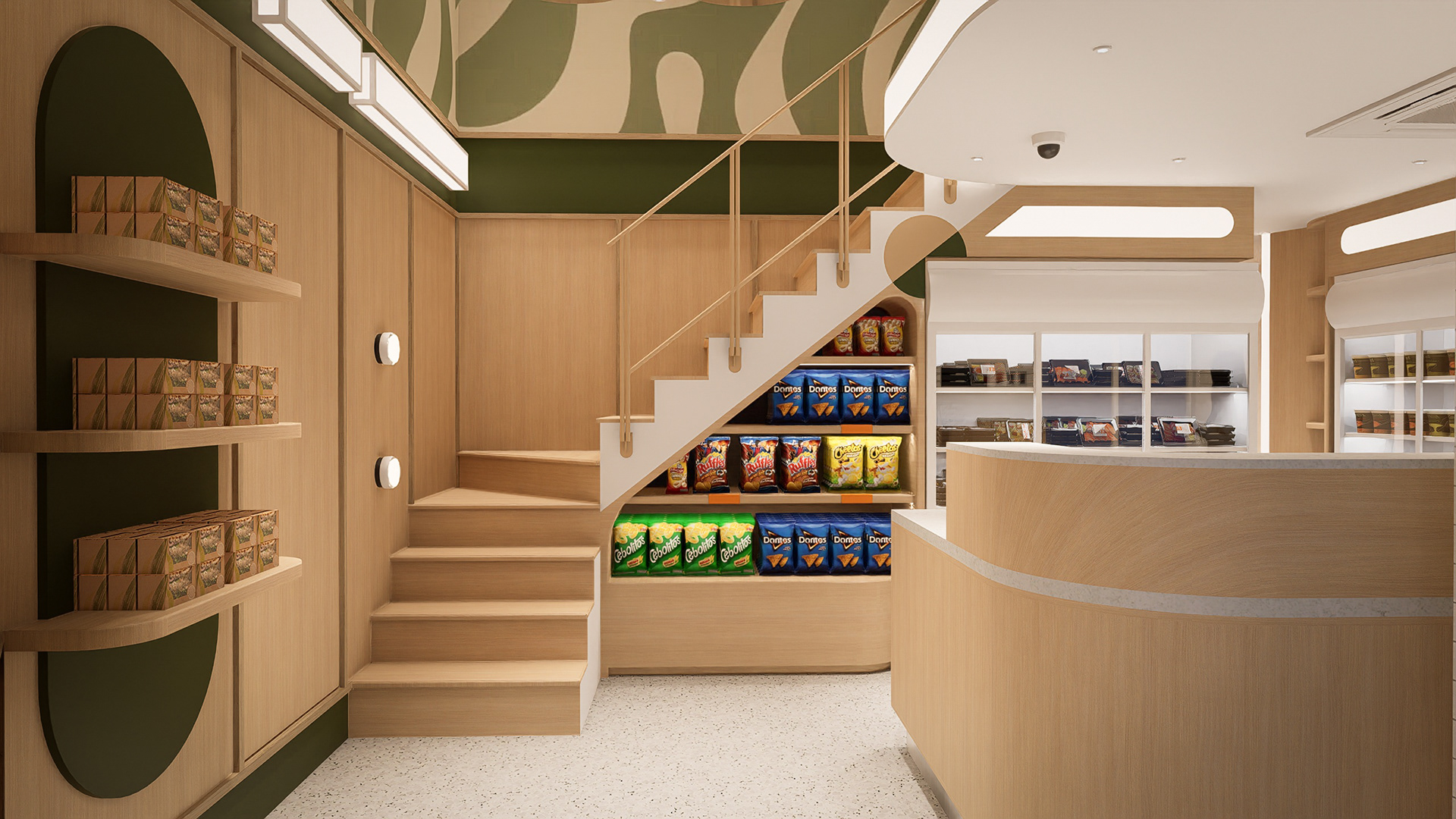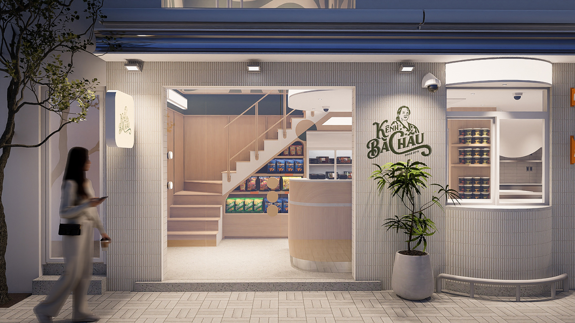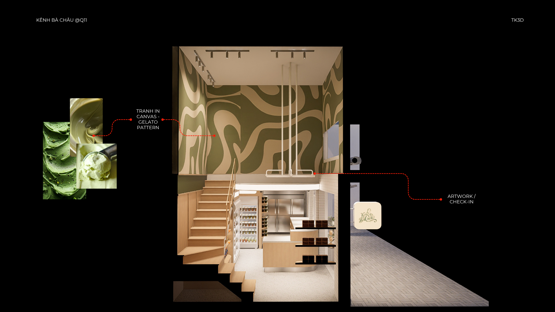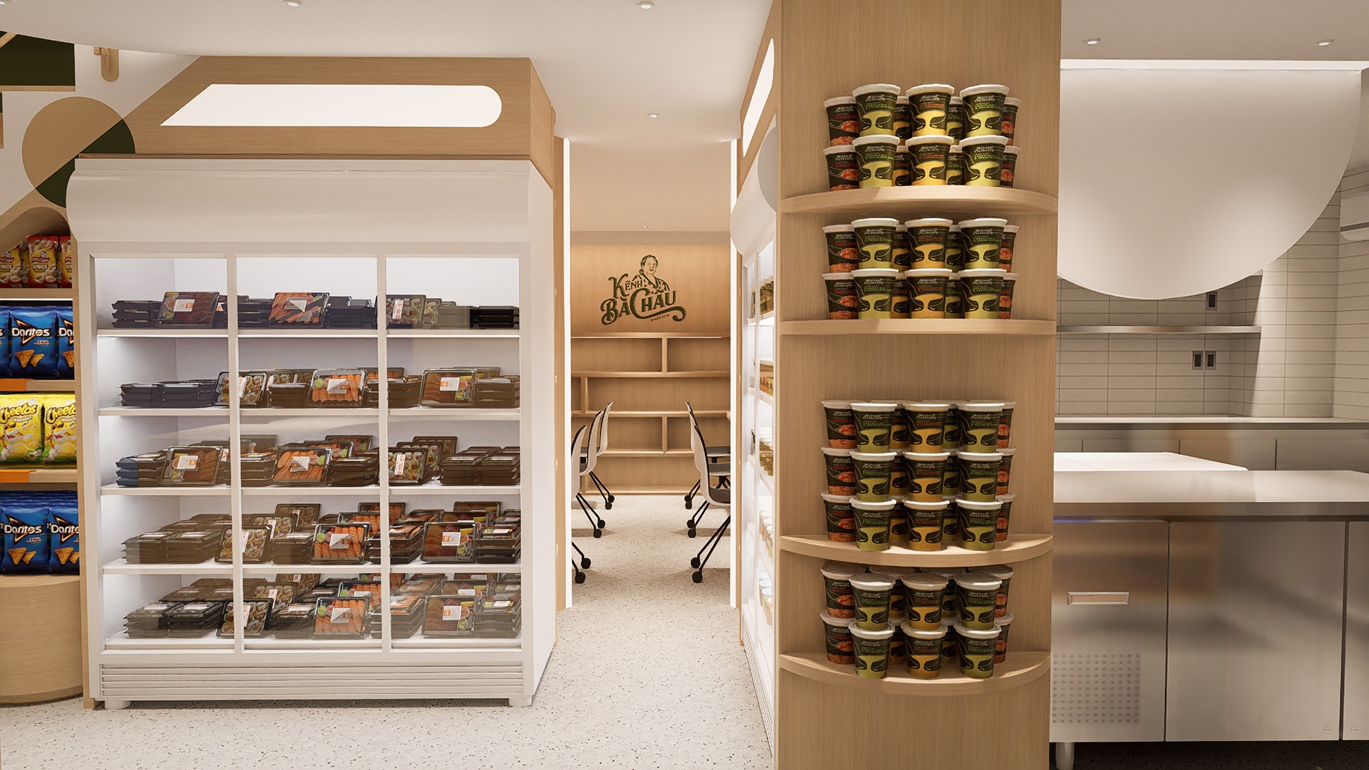Ngược lại, khu vực FOH dành cho khách đến lấy hàng trực tiếp lại được ốp gỗ tạo cảm giác liền lạc, ấm cúng và gần gũi hơn. Sự chuyển đổi vật liệu giữa hai khu vực thể hiện rõ quan điểm thiết kế của CGK: tối ưu hiệu quả vận hành ở phía sau, đồng thời giữ được trải nghiệm thương hiệu thân thiện và dễ nhớ ở phía trước.