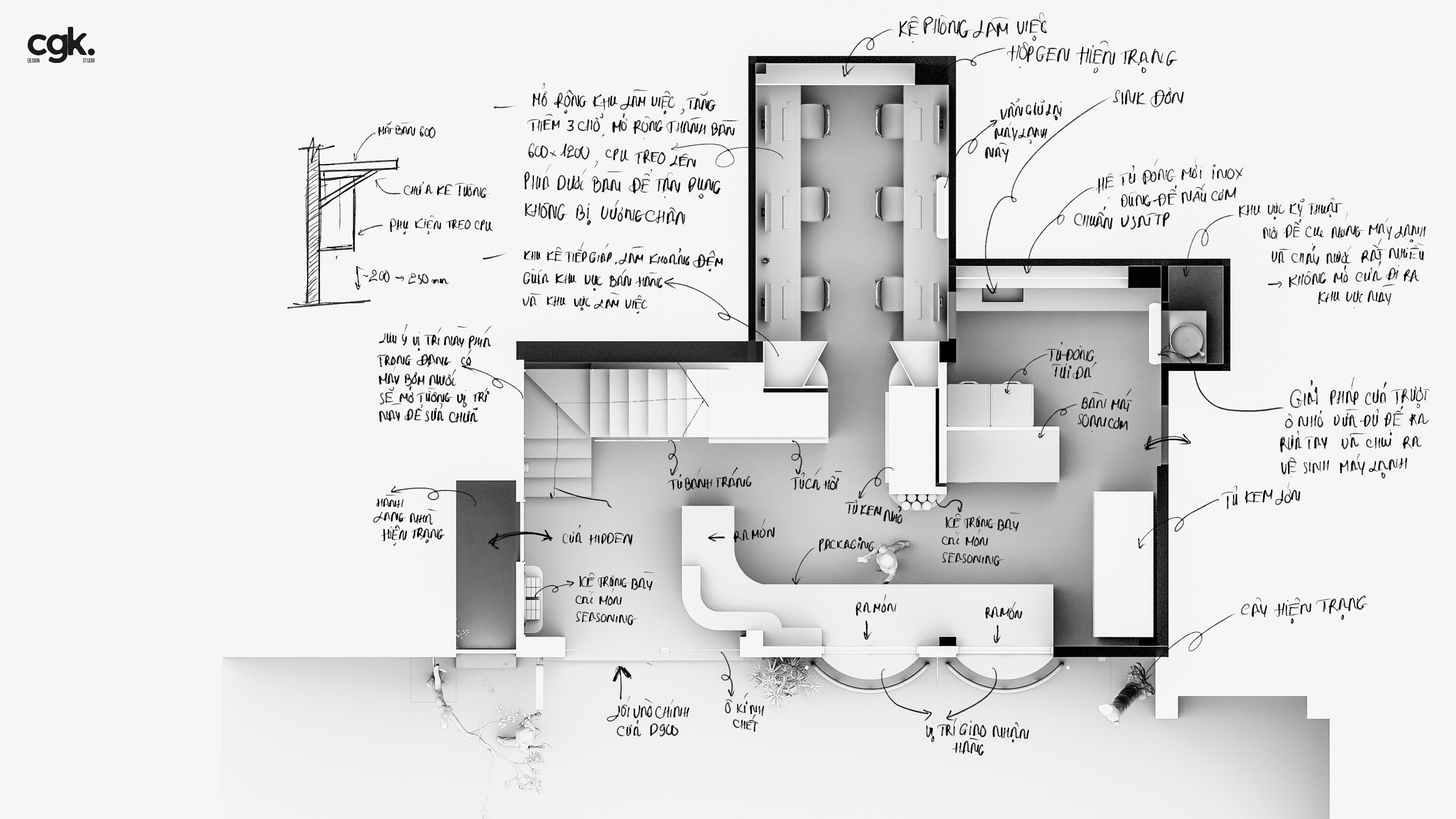 CGK đề xuất phương án tháo dỡ các vách hiện trạng bên trong và đập thông toàn bộ khối nhà, tạo nên một mặt bằng liền mạch. Thay vì xây lại vách cứng, nhóm thiết kế tận dụng các vật dụng và hệ tủ để chia khu chức năng, vừa tiết kiệm vừa tạo sự linh hoạt cho việc sắp xếp sau này. Luồng giao thông được tổ chức lại rõ ràng, tối ưu từng mét vuông sử dụng, đảm bảo quá trình vận hành diễn ra nhanh và thuận tiện.