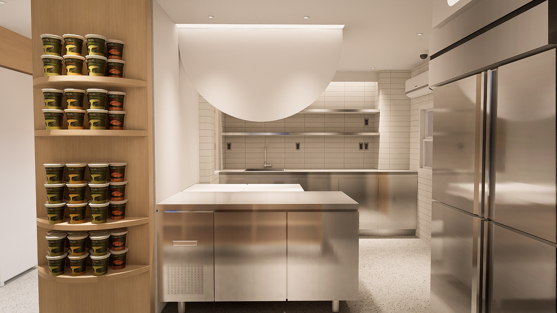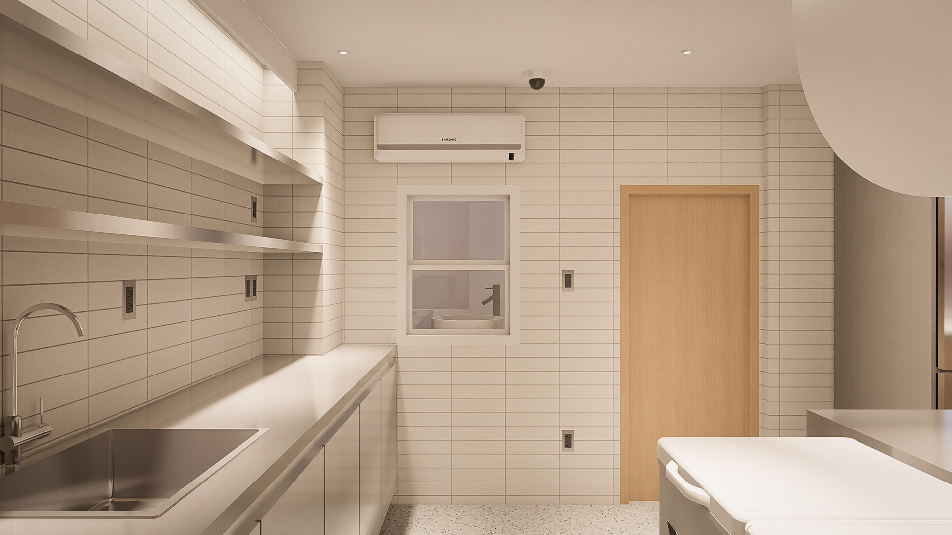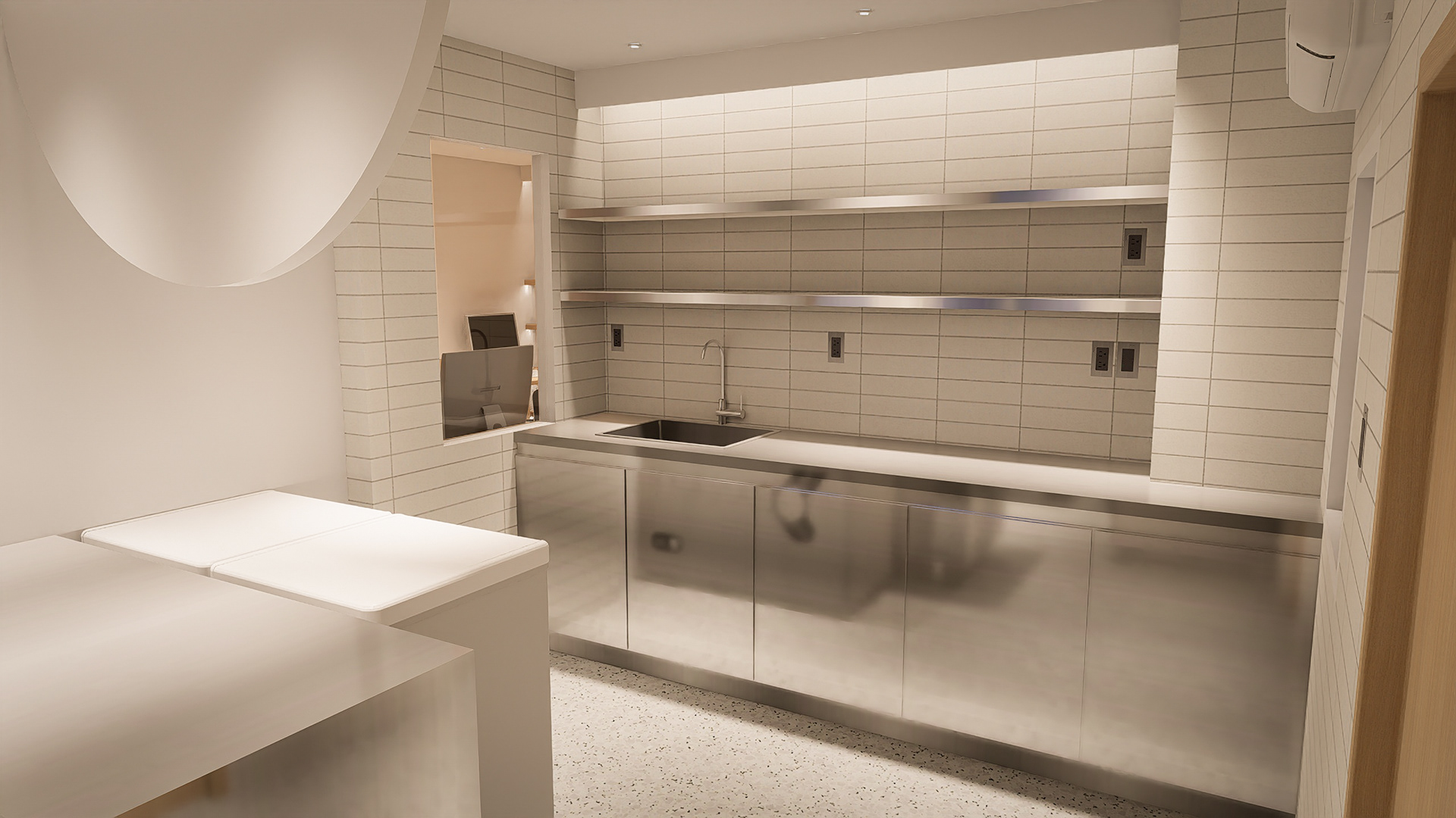 Ở khu vực BOH và bếp, gạch thẻ vỉ porcelain kết hợp ron epoxy được sử dụng nhằm tăng khả năng chống thấm, hạn chế bám bẩn và giúp việc vệ sinh trở nên dễ dàng hơn. Các bề mặt thao tác và hệ tủ được hoàn thiện bằng inox để đảm bảo tuổi thọ cao, không bị oxy hoá khi tiếp xúc thường xuyên với gia vị và hơi ẩm.